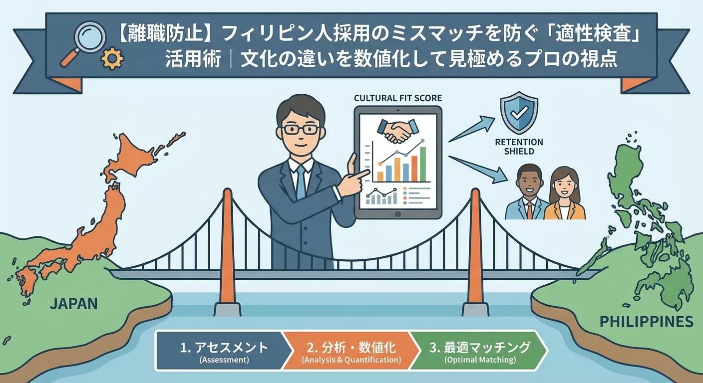 外国人採用、特に文化背景が大きく異なるフィリピン人採用において、面接時の「印象」だけで判断することは極めて高いリスクを伴います。本記事では、B2Bコンサルティングの視点から、離職防止の鍵となる「適性検査」の活用術と、文化の違いを数値化して見極めるための具体的な戦略を解説します。